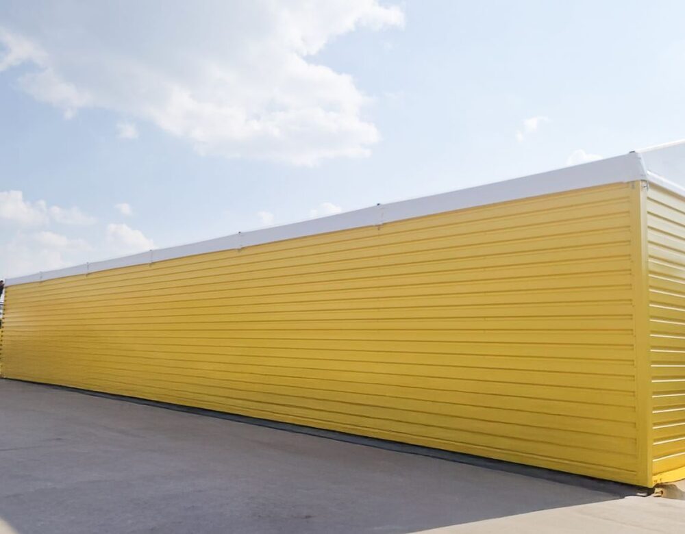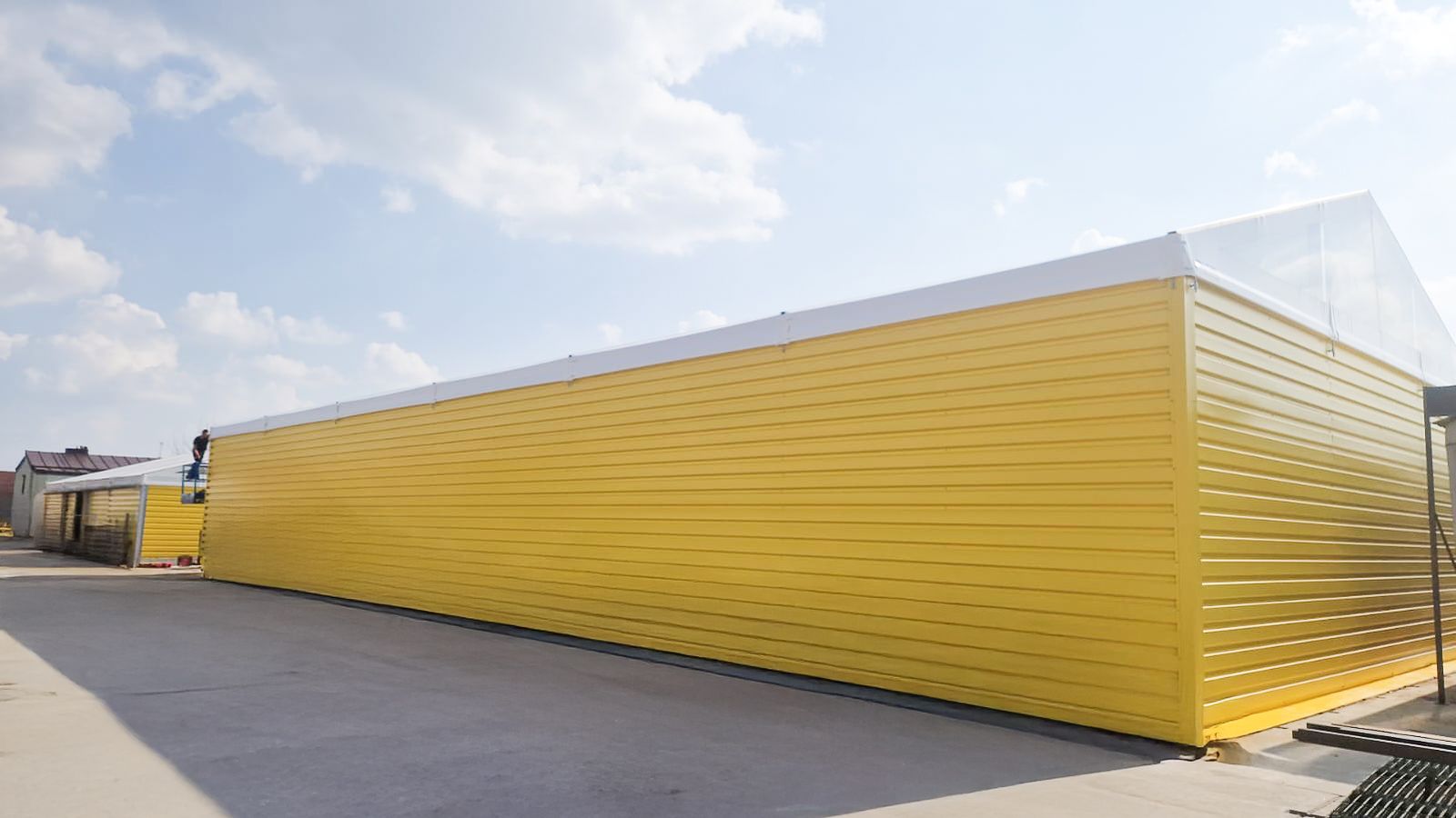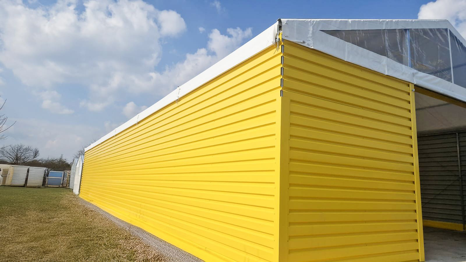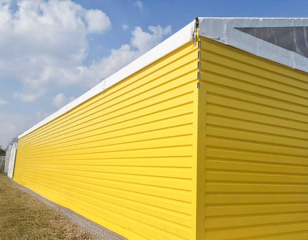 La sfida principale era quella di combinare una struttura leggera e mobile con soluzioni che garantissero il comfort d’uso, tra cui la realizzazione di un controsoffitto in pellicola rinforzata con scarico della condensa, che contrasta efficacemente la formazione di vapore acqueo. Un ulteriore aspetto era l’installazione di teli in pellicola per finestre, che dovevano essere tesi con precisione e integrati con l’intera struttura del tetto e delle pareti.