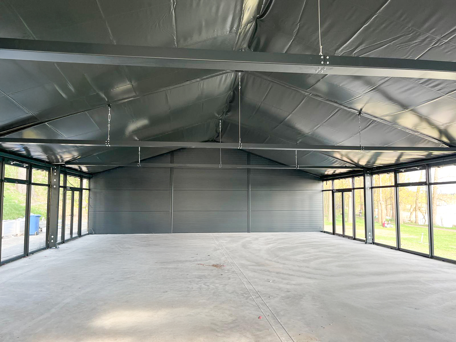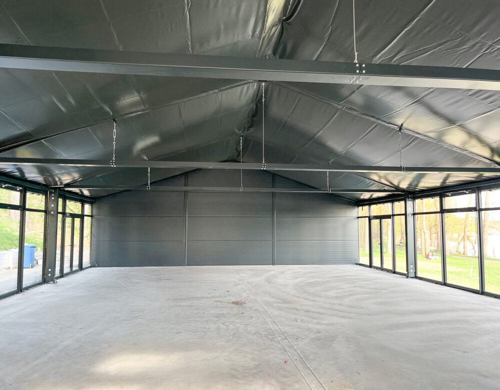 Le chapiteau achevé, mesurant 12 × 40 m et 3,15 m de haut, est une structure à pignons avec une toiture en PVC tendue de couleur 814, montée sur un système fileté. Le soffite intérieur THERMO avec évacuation de la condensation a été conçu pour améliorer le confort des utilisateurs, tant sur le plan thermique que visuel. La structure répond aux exigences d’une zone de charge de neige de 90 kg/m² et d’une charge de vent de 22 m/s.