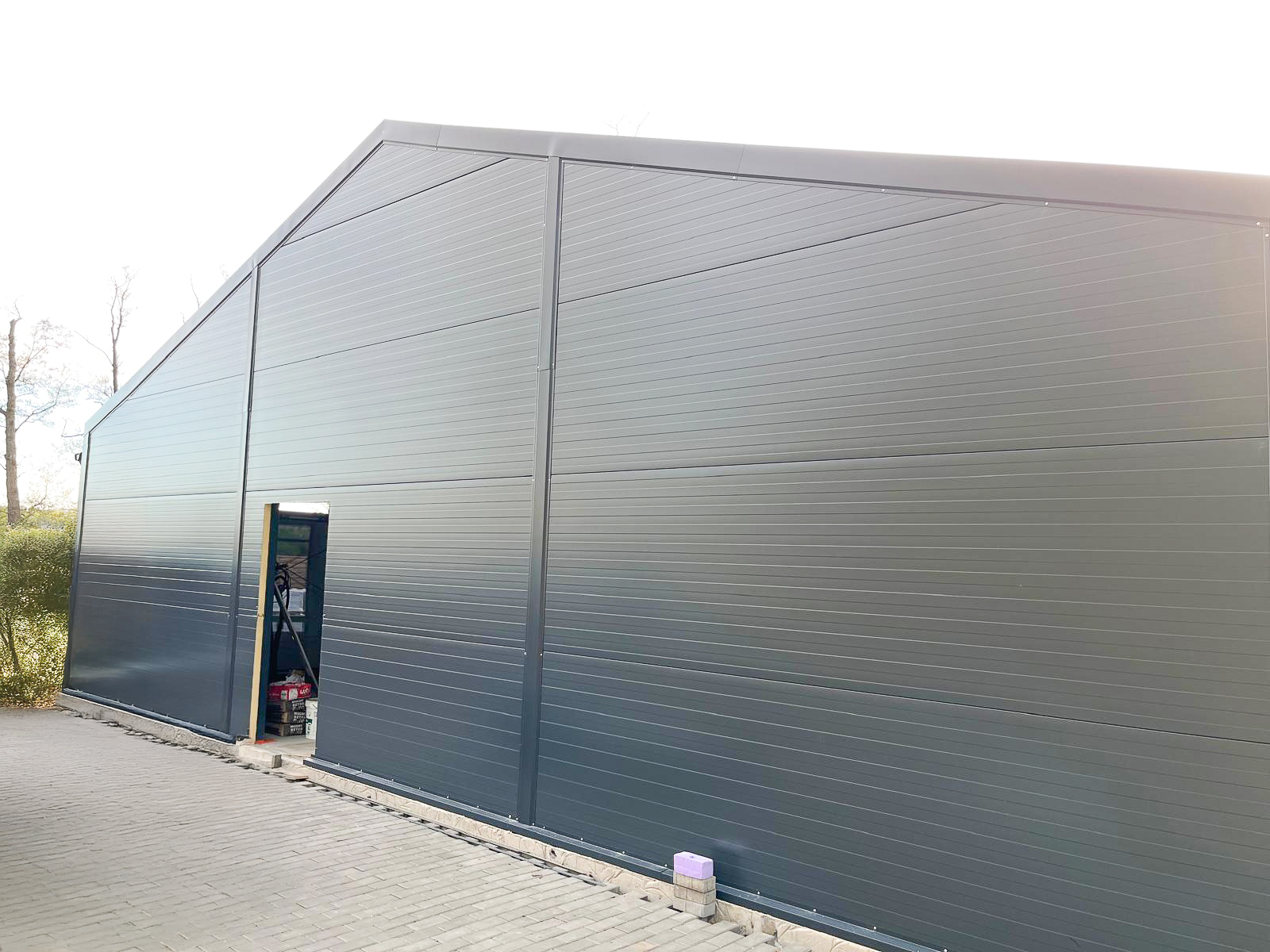 Le hall a été ancré aux fondations par des vis d’ancrage. Les parois latérales sont constituées de panneaux sandwich horizontaux et l’un des pignons est divisé par une paroi supplémentaire de 60 mm d’épaisseur (RAL7016).